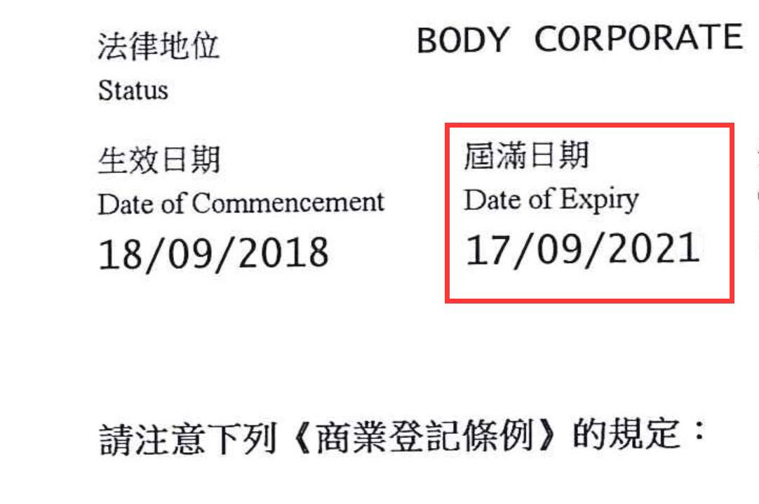 香港公司年审日期跟年结日不一样的。香港公司年审日期一般是根据商业登记证上的届满日期而定,通常在届满日期前一个月就可以开始办理香港公司年审。如上图,商业登记证届满日期为2021年9月17日,那可以在8月份联系秘书公司办理年审了。当然,大多秘书公司也同样是在这个时间段主动联系客户办理年审的。