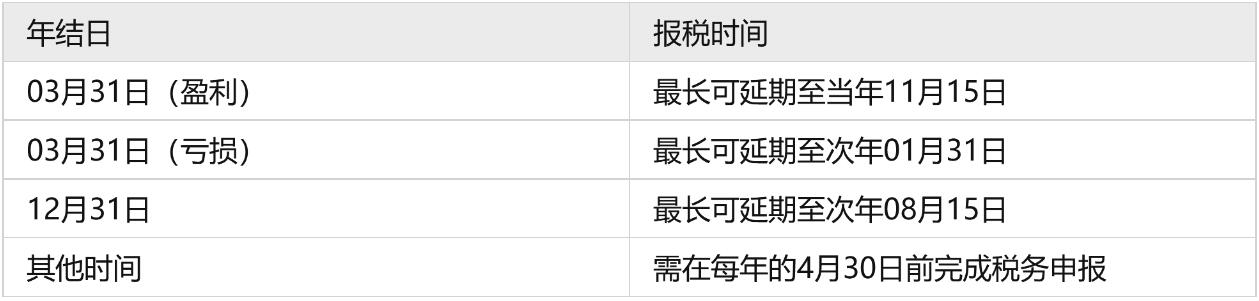 2. 非新成立的香港公司报税时间:根据本公司财务年结日,按时递交审计报告及税表。(不同年结日宽限期限不同)